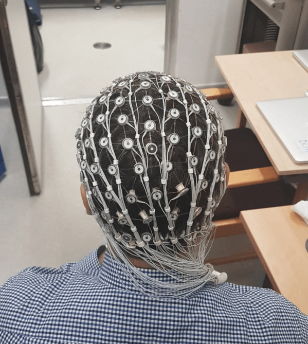 It is a neuroimaging technique to measure the electrical potential at different points of your scalp, which is generated by the activity of large group of neurons in your brain. The signals are picked up by 128 electrodes that are positioned in your head. This technique is considered non-invasive, safe, causing no discomfort or harm. You will NOT receive any shocks or feel any discomfort. The electrodes are to fixed to your head with a net (Geodesic Sensor Net) that is non-allergenic and washable. In order to improve the conductance of the signal from the scalp to the sensors, the electrodes are filled with a water-soluble gel that is safe for humans, does not provoke physical reactions and is easily removed.